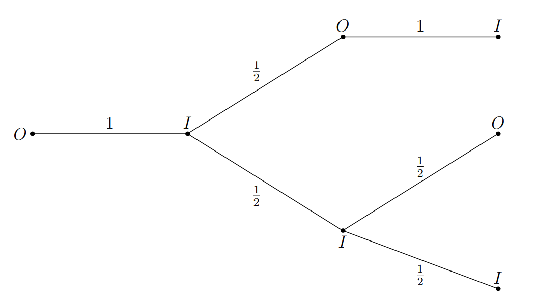 From all the possible endpoints, we can see that only one branch ends at an outer point. So we multiply the probabilities along the path from the starting outer point to the ending outer point and get our final probability: .