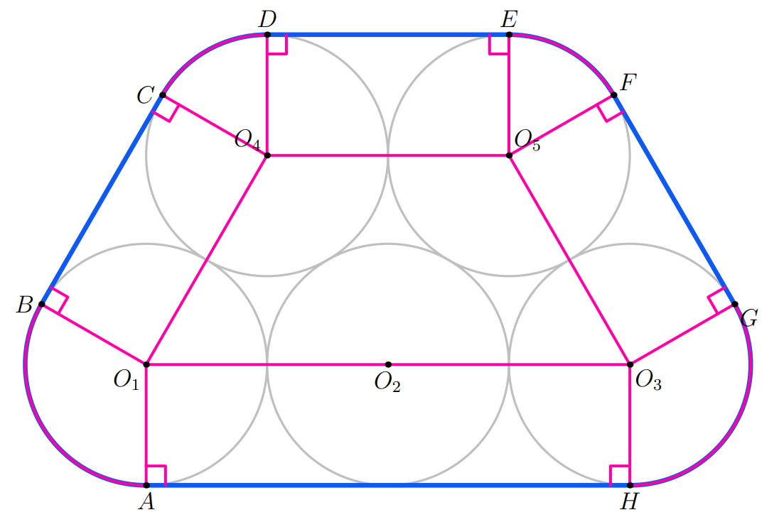 For the curved sections, we can examine angles to find their lengths. Let the angle β CO4βD be xβ. Since the angles around center O4β must sum to 360β and we know both β DO4βO5β and β CO4βO1β are right angles, β O1βO4βO5β=360ββ90ββ90ββxβ=(180βx)β. O4βO5βO3βO1β is a trapezoid (since O4βO5β and O1βO3β are parallel) so β O4βO1βO3β+β O1βO4βO5β=180ββΉβ O4βO1βO3β=xβ. And symmetrically, β EO5βF=xβ,β O4βO5βO3β=(180βx)β, and β O5βO3βO1β=xβ. Thus, we also know that β BO1βA=β GO3βH=(180βx)β. Then looking at the sum of all of the inscribed angles of the arcs, we see that they sum up to 360β, since β BO1βA+β CO4βD+β EO5βF+β GO3βH=(180βx)β+xβ+xβ+(180βx)β=360β. Therefore, the total sum of the curved sections equals the length of the circumference of one circle or 4Ο, making our final answer equal to (C) 4Ο+20β.